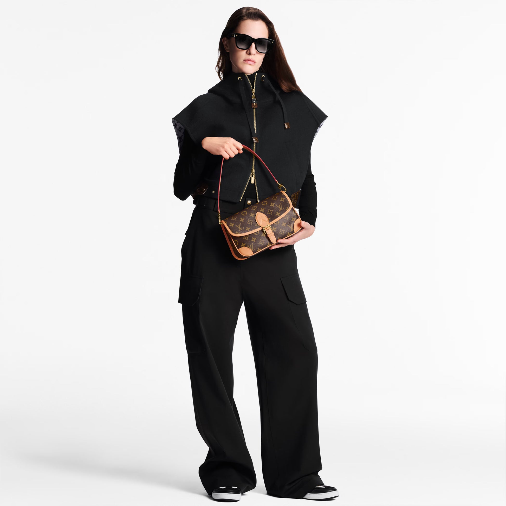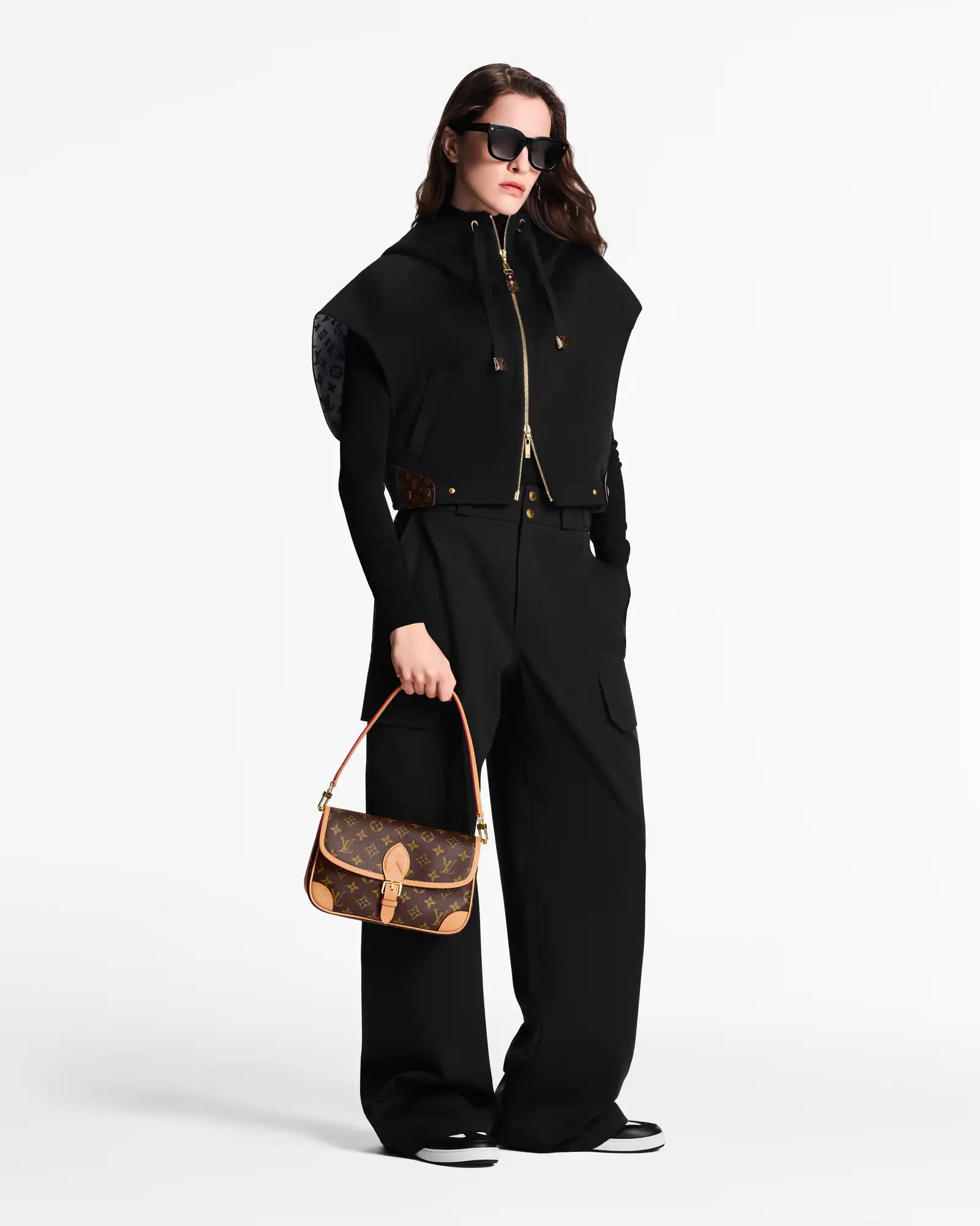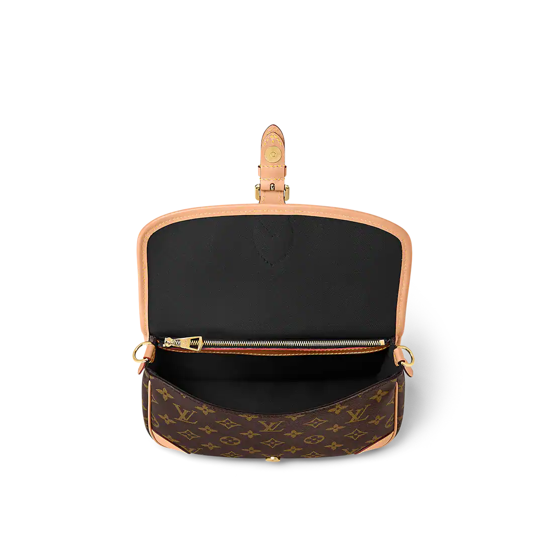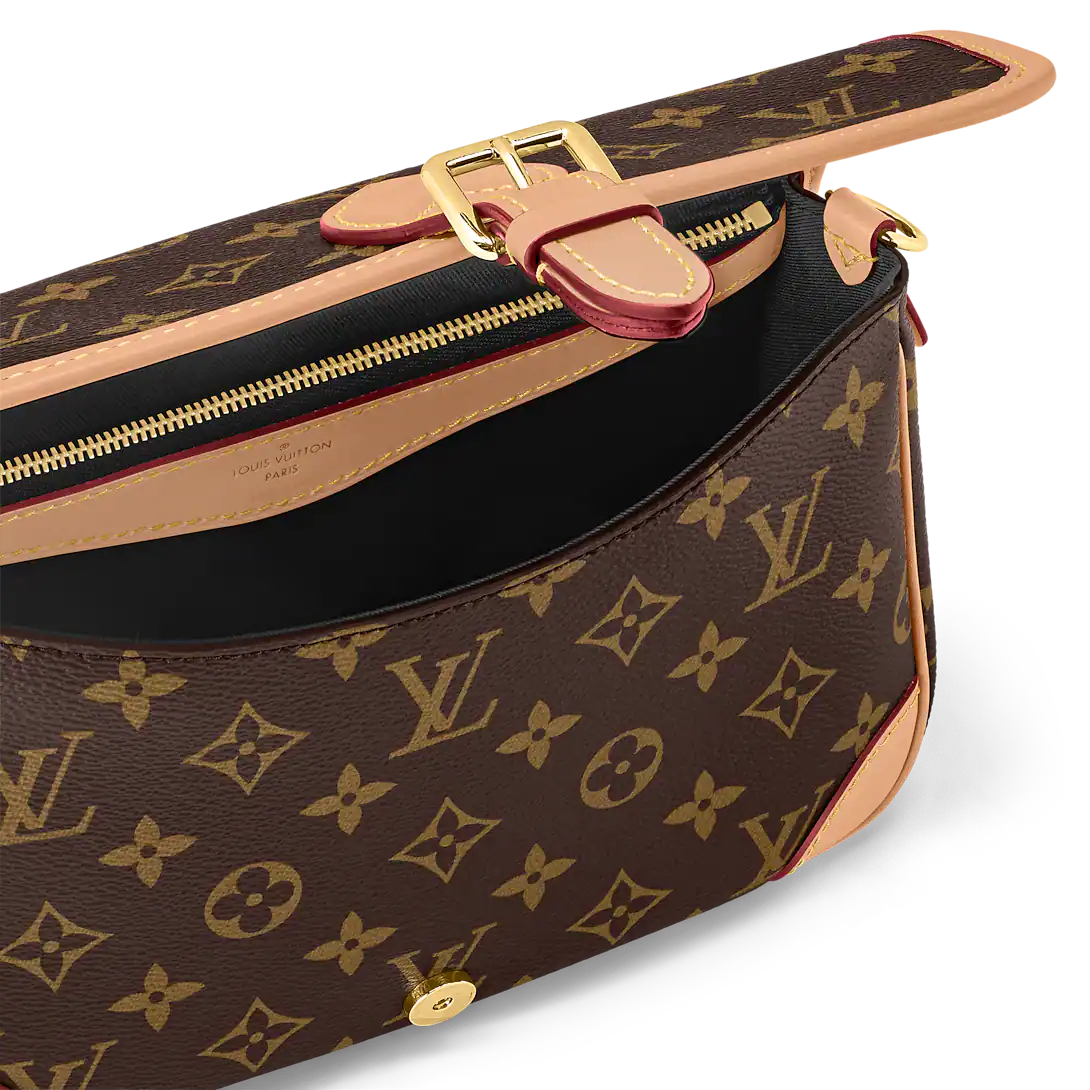 The Diane satchel in Monogram canvas revisits a classic model from the 90s, combining such vintage details as leather corners and an archival-inspired buckle with the modern functionality of smart pockets and a well-organized interior. The exclusive wide jacquard strap reverses from a bold Louis Vuitton signature to a subtle Monogram Flower motif.